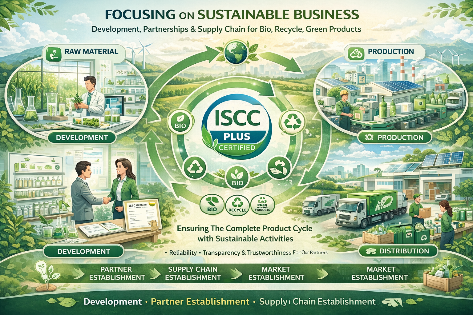 We focused our Sustainable business from Development, Partner Establishment, Supply Chain Establishment and Market Establishment for Bio, Recycle, Green Products to support our partners and society.