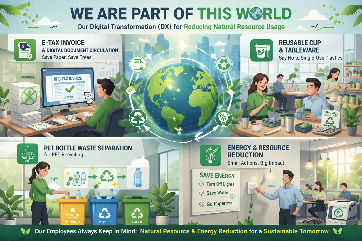 As we are part of this World, our Digital Transformation (DX) to reducing our Natural resource usage including E-Tax Invoice, Document Circulation to reduce Paper resource. Promoting employees usage of reusable cup and tableware to reduce Single-use Plastics resource. PET Bottle waste separation for PET recycle.